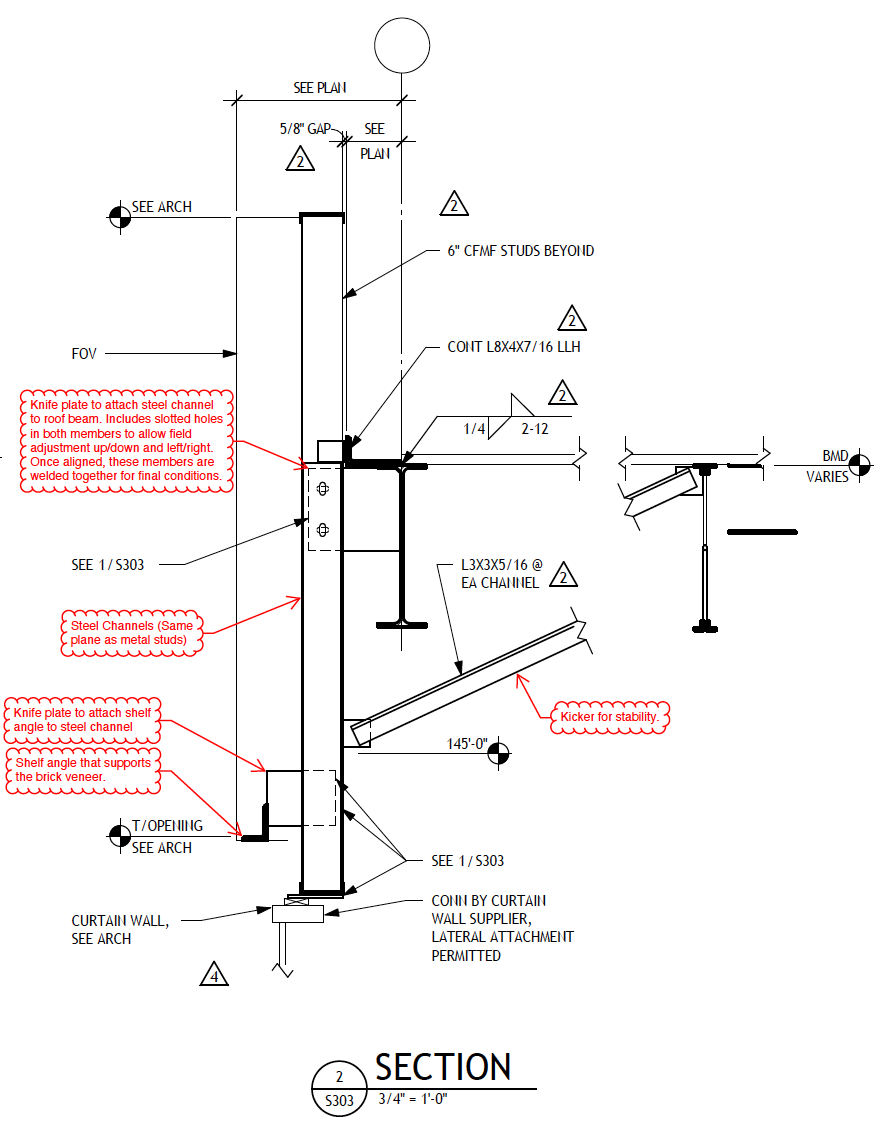 To hold up the elevated brick, steel channels hang from the roof or floor framing and line up with the wall studs. A shelf angle attaches to the steel channel, which supports the brick veneer. For stability, a kicker is added inside, usually above the ceiling so it stays hidden. The diagram shows how many extra steel pieces are needed to hang the brick, and these supports are placed every 48 to 64 inches around the building, matching the spacing of the studs.