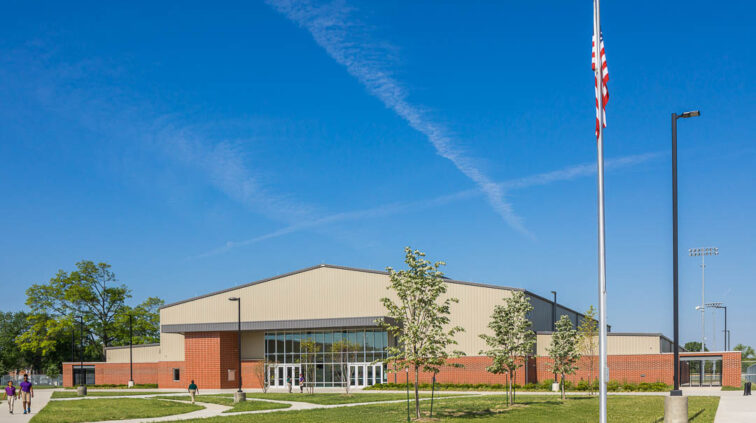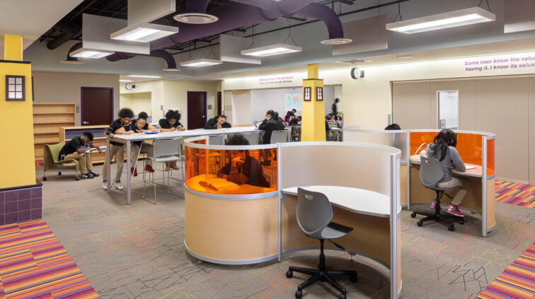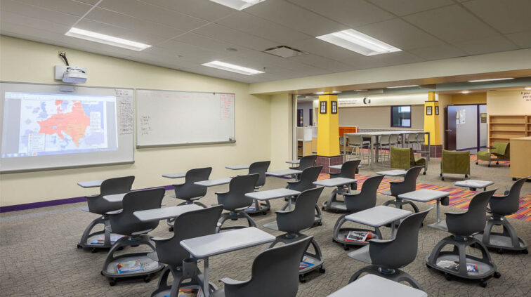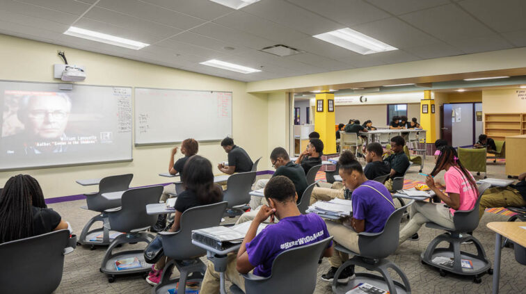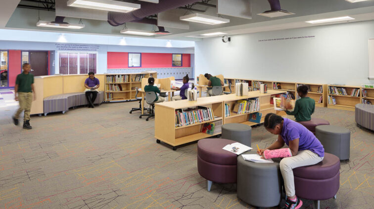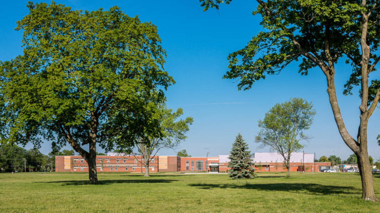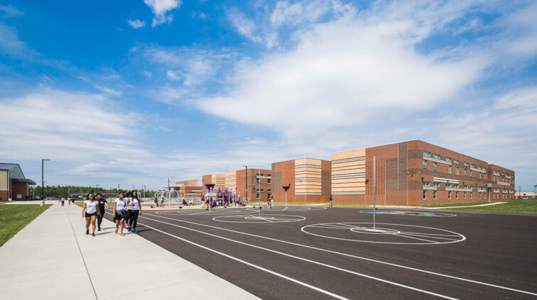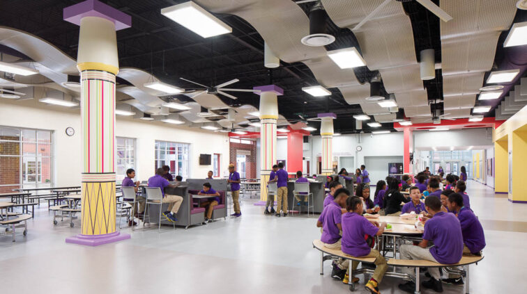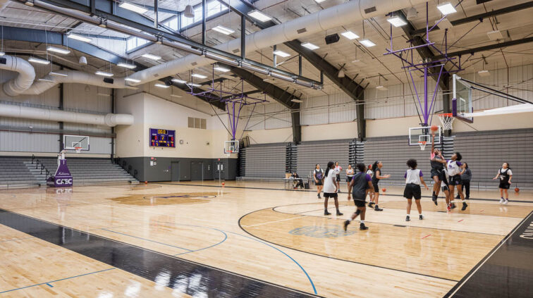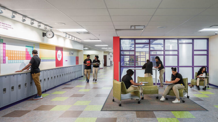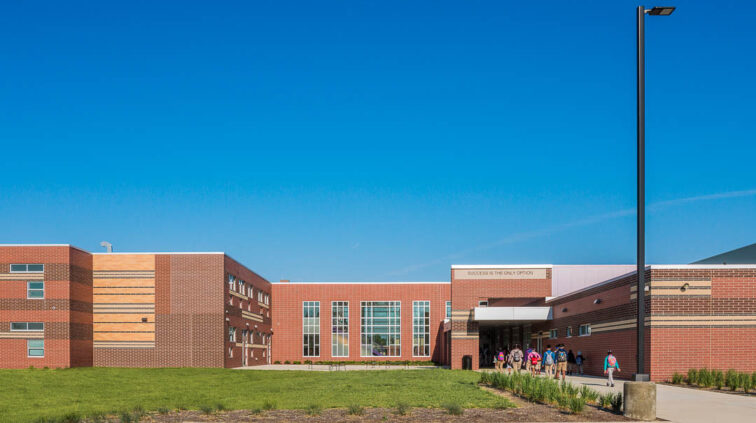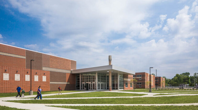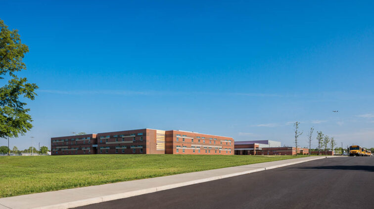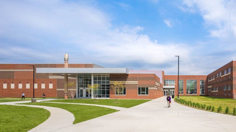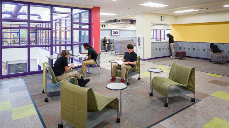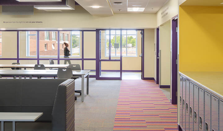 The southern structure is a two-story building designed with steel joists and steel framing supporting roof decks and floor slabs on deck. Reinforced concrete masonry forms the majority of the load-bearing walls. The building is divided into neighborhoods by wing and floor to separate the elementary, middle, and high school students. The structure supports generous daylighting into the classrooms, the laboratory, and the alternative learning centers.