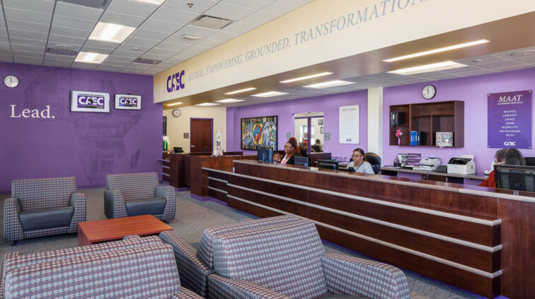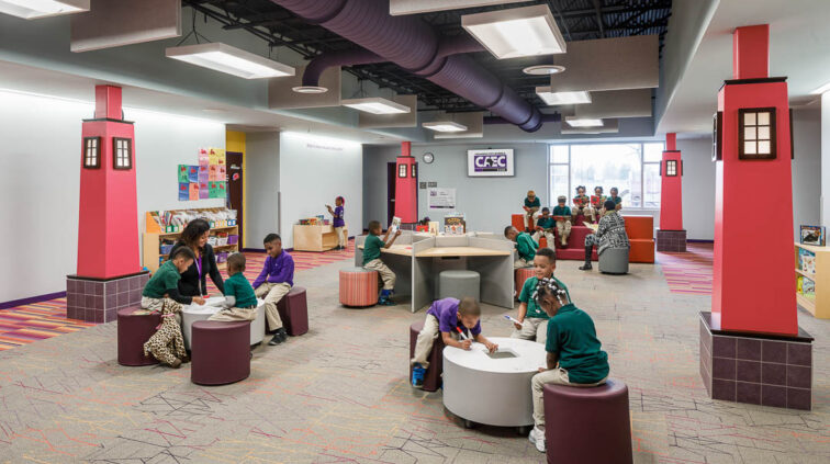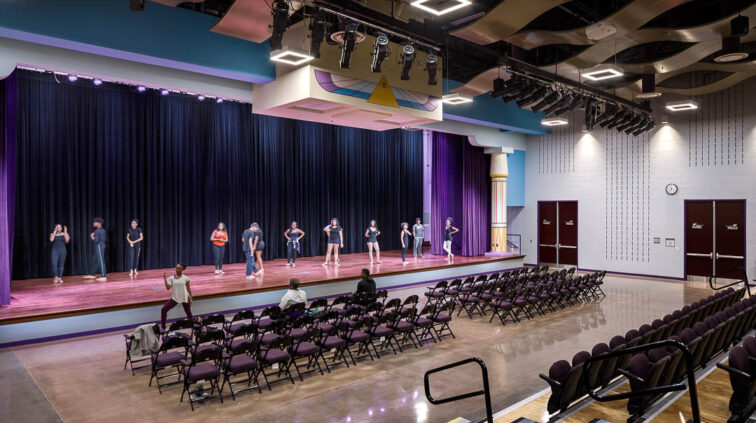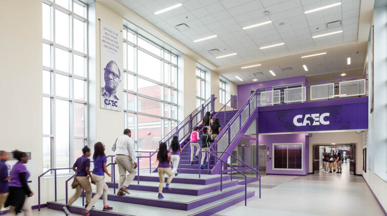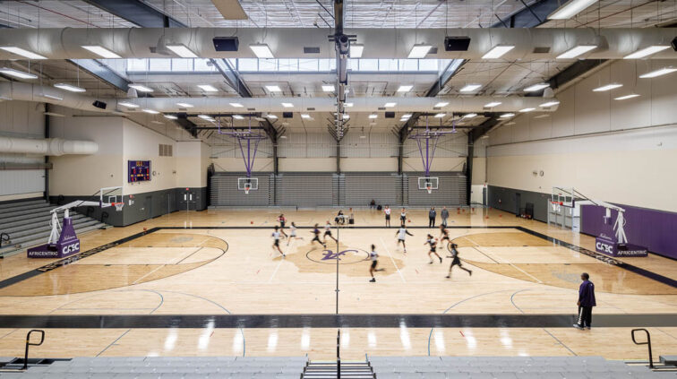 The Africentric Early College PK-12 school is a new two-story, 145,000 SF building. The structure is considered as two buildings connected by an enclosed pedestrian walkway. The northernmost structure is a tall one-story building containing a small gymnasium, an auditorium, spaces for the vocal and instrumental music program, the kitchen and cafeteria, and administrative offices. The structure is steel joist and steel framing with reinforced concrete masonry. The main entry has a concrete and steel post suspending a roof structure with clerestory glass.
