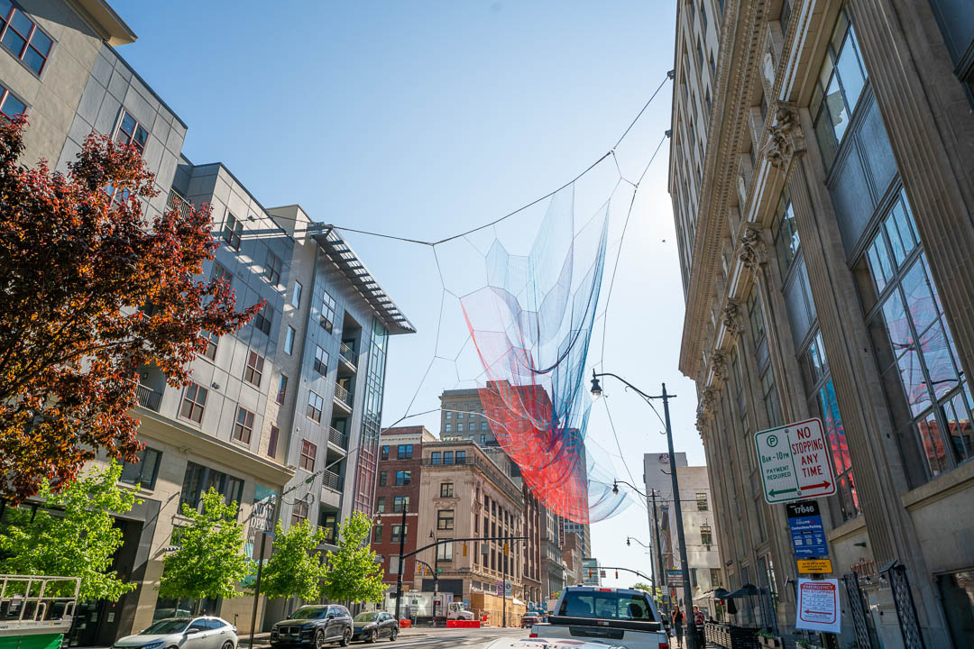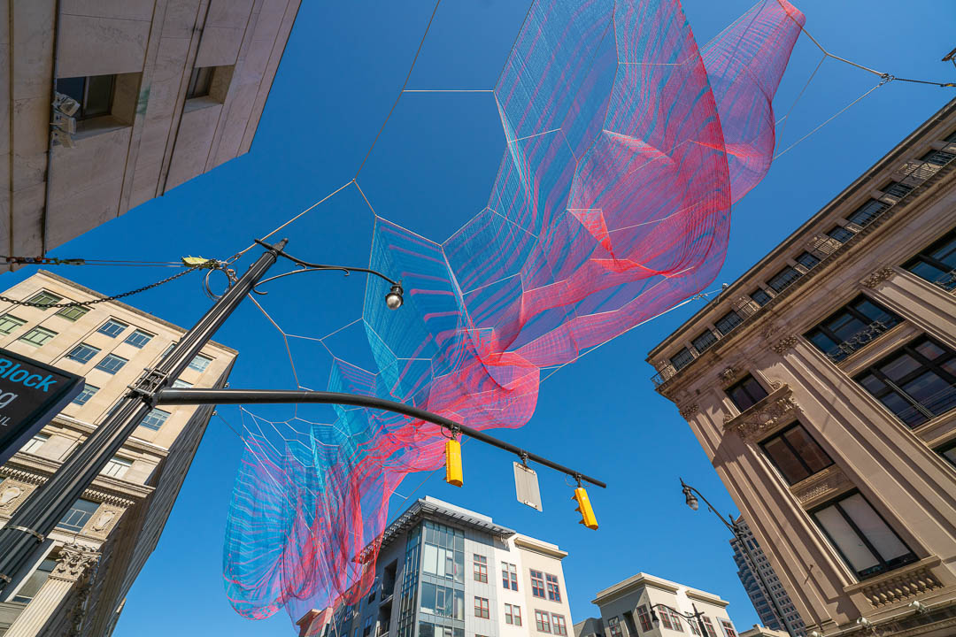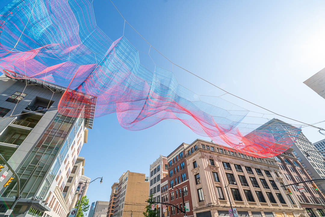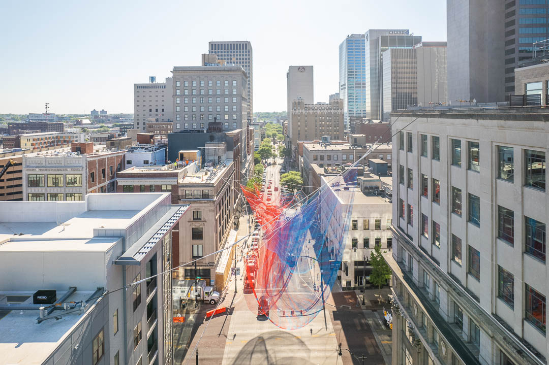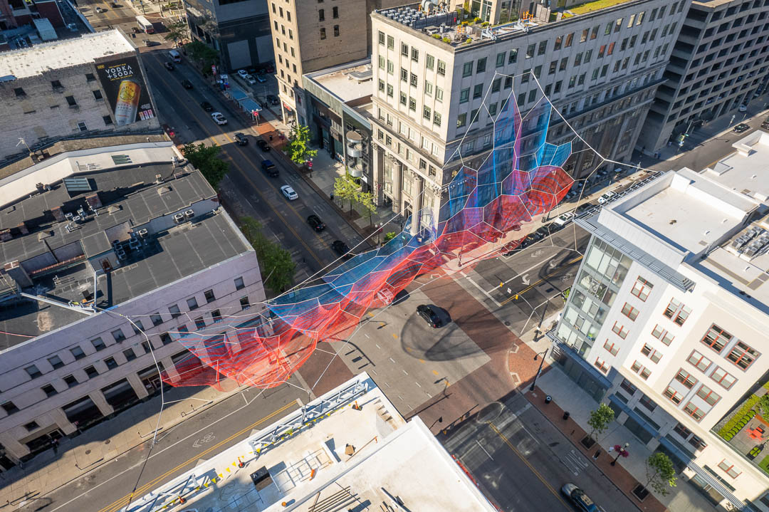We loved working on the newest and most significant private contribution to public art in Columbus that hangs at the corner of High and Gay Streets. Illuminated at night and visible from all four directions at different elevations, the sculpture can be seen by airplane. Janet Echelman’s piece comprises 78 miles of twine woven into over 500,000 knots, which spans 83 feet wide and 229 feet long, 128 feet in the air.