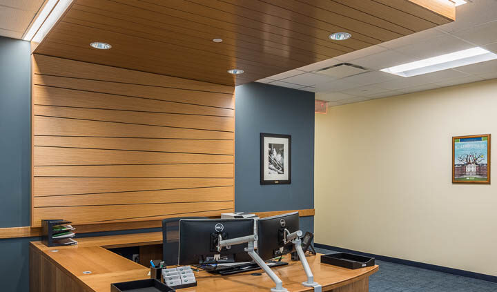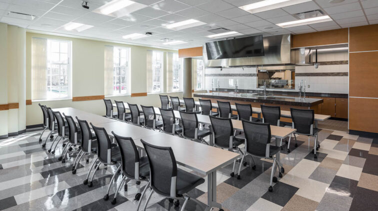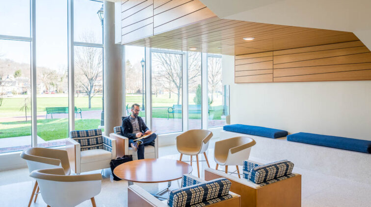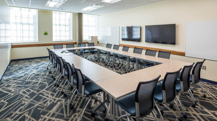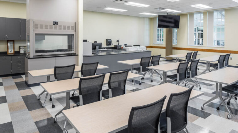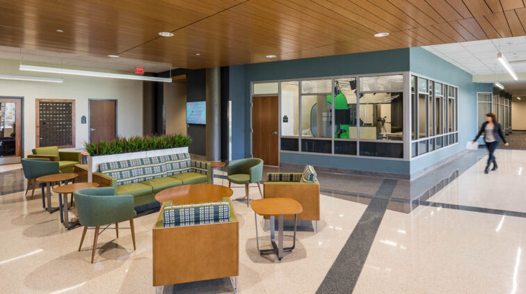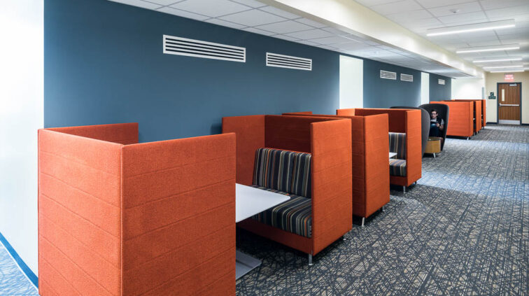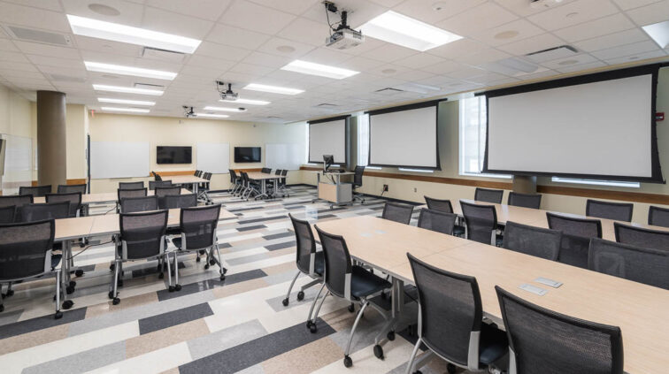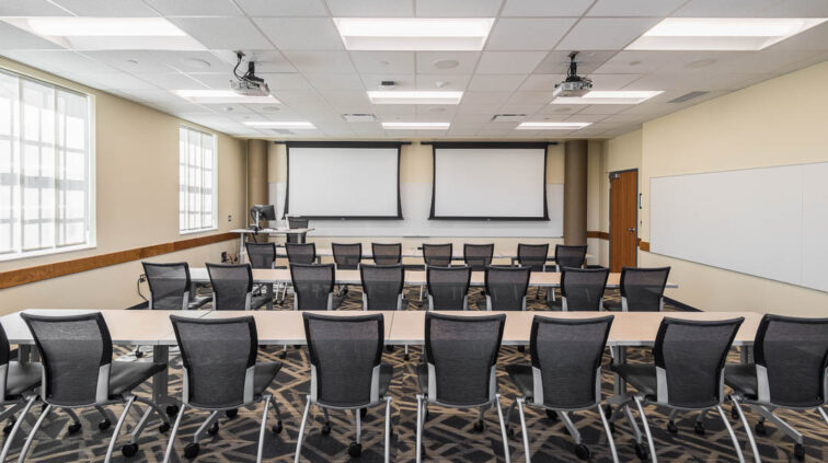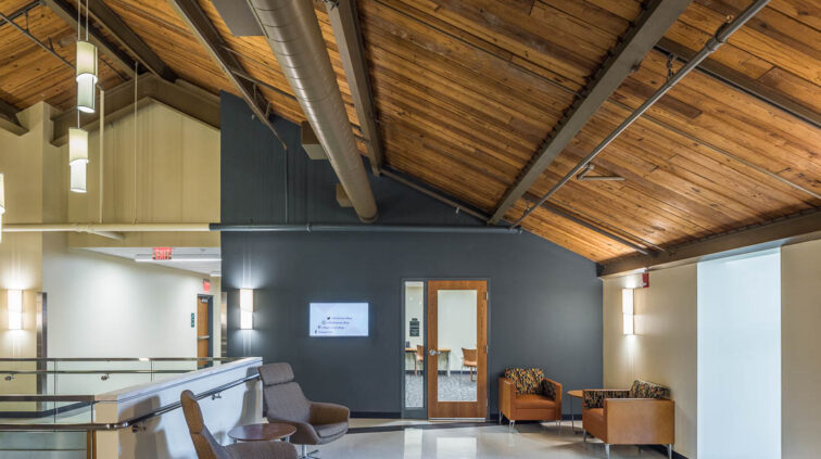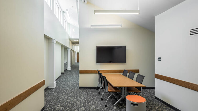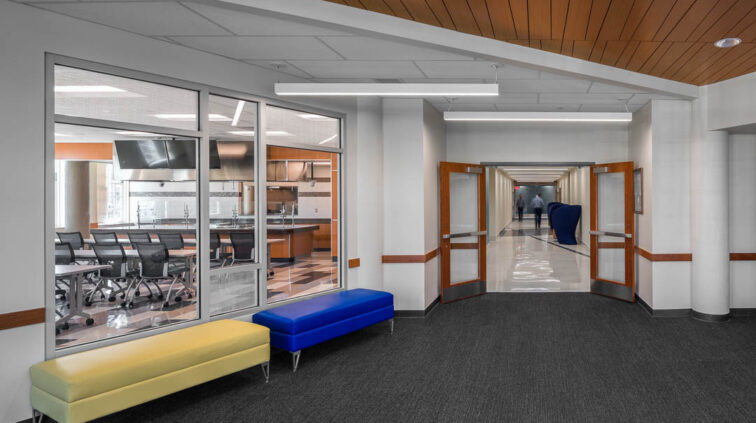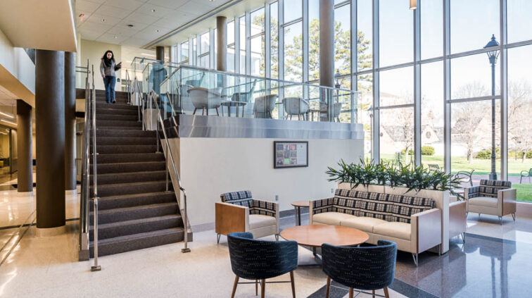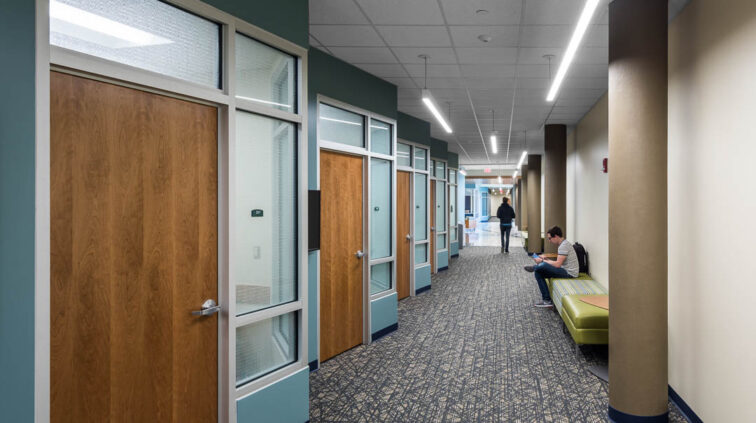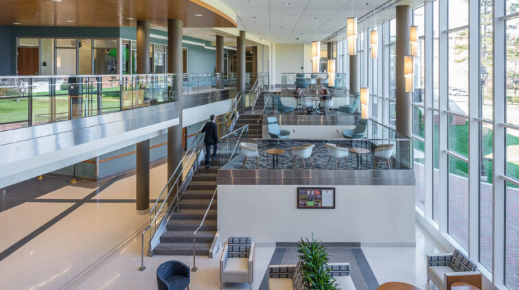 This project reimagined McCracken Hall with a dynamic space layout, creating an attractive, flexible environment for formal and casual learning. The interior design created various classroom types and sizes and plenty of faculty office and support space. Collaboration between students and faculty is supported through a series of smaller project rooms and varied gathering areas, both large and small.