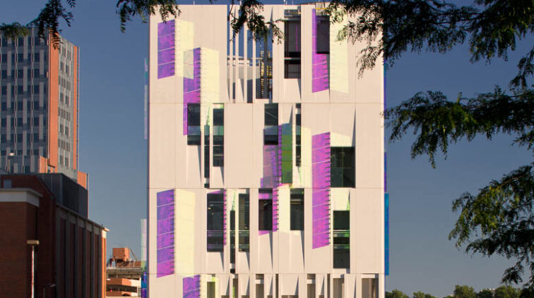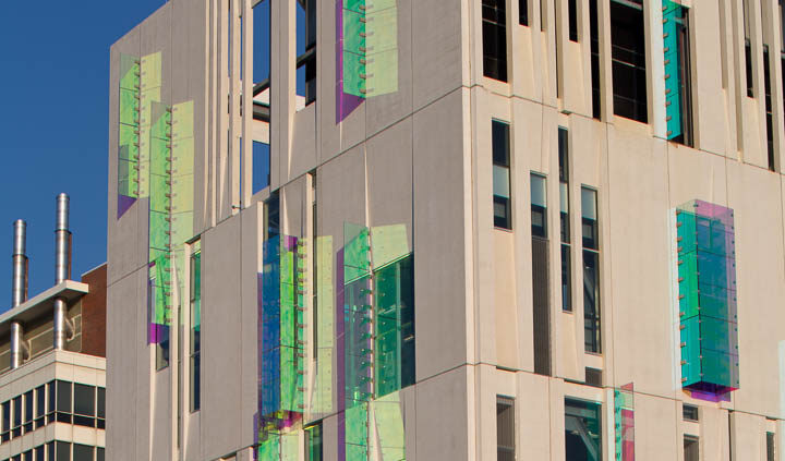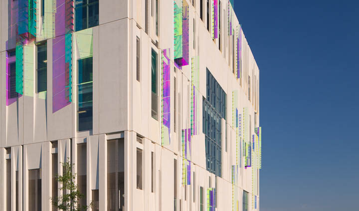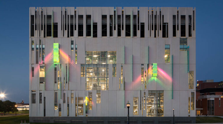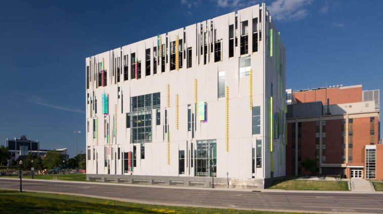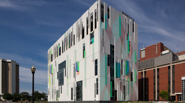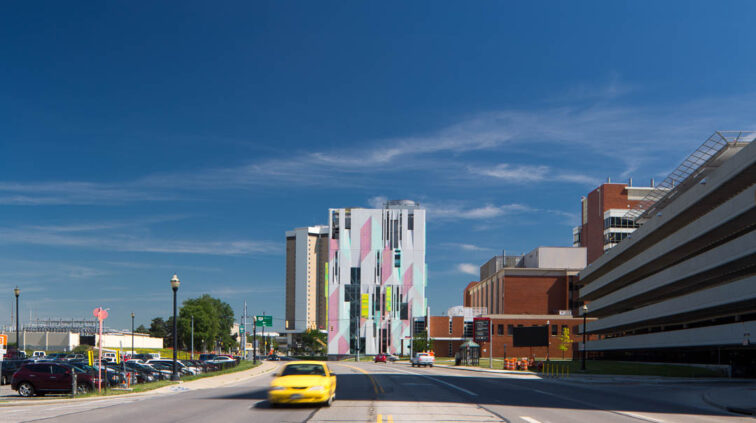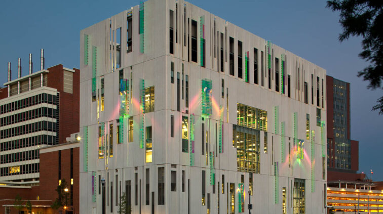 The South Campus Central Chiller Plant provides chilled water to support critical functions and operating rooms throughout the OSU medical campus, including the new Critical Care Tower. The three-story building stands 125 feet above grade and includes a basement built in the flood plain – designed as an inverted bathtub to ensure the equipment remains dry and functioning. A 35-foot screen wall at the top of the building conceals cooling towers.