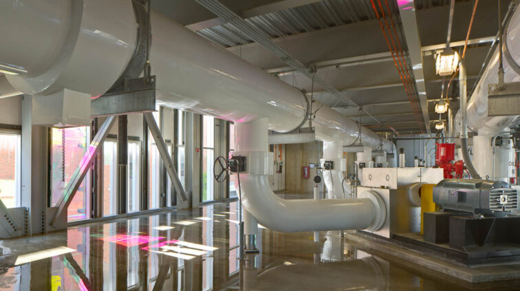 The structure was required to support extensive equipment and piping loads, including chillers weighing 127,000 pounds each, cooling towers weighing 121,000 pounds, and 42” diameter pipes. Extensive coordination was required to properly support the equipment and allow user flexibility in the future while keeping structure costs within budget.