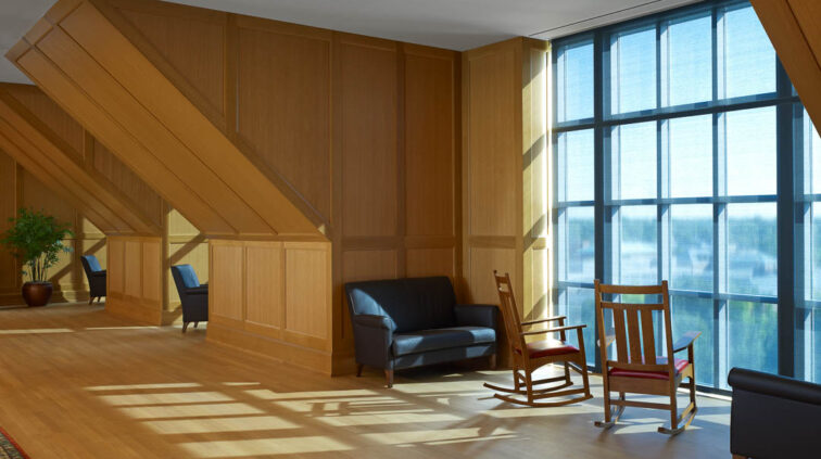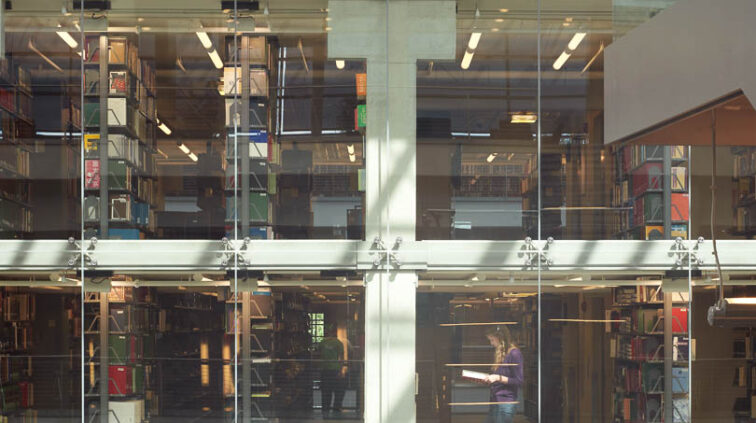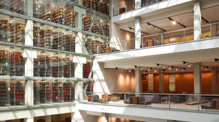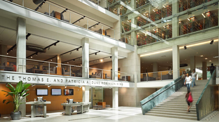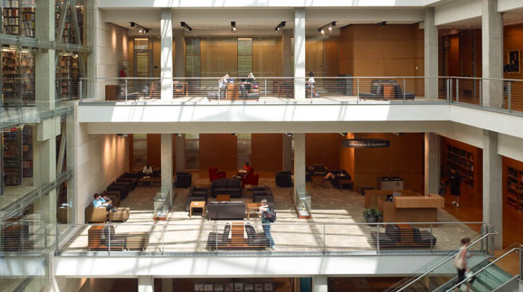 To achieve the architect’s vision for the project, SMBH had to develop several creative engineering strategies. For example, large portions of bearing walls were removed in the original building to allow for a four-story atrium, which required innovative framing solutions to maintain the existing floors and roof while the supporting walls were removed. Steel plate shear walls were used in the stacks tower so that the presence of new bracing did not reduce the book stack capacity. Understanding the existing structure was crucial to the success of this project. One of the project’s goals was to take a dark and enclosed building, make it open, and bring in daylight. This resulted in numerous requests to SMBH to see if portions of the existing structure could be removed or modified.